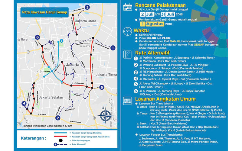 Ruas jalan yang terkena aturan ganjil genap. Secara keseluruhan kini ada 15 ruas jalan yang masuk dalam sistem tersebut. Kawasan ganjil genap tahun 2019 tidak ada beda dengan kawasan ganjil genap tahun 2018. Dinas perhubungan pemerintah provinsi dki jakarta pada senin 2562018 pun menginformasikan enam jalur alternatif demi memudahkan pengguna jalan. Kepala dishub dki jakarta syafrin liputo mengatakan ada sebanyak 16 ruas jalan baru yang dibatasi untuk kendaraan nomor pelat ganjil beroperasi pada tanggal ganjil dan kendaraan nomor pelat genap mengaspal tanggal genap di jakarta. Pengendara yang terkena dampak diberi jalur alternatif meliputi jalan ra kartini dan jalan ciputat raya. Berikut adalah ruas jalan yang kena imbas perluasan skema ganjil genap dan ruas jalan lain yang bisa dipakai sebagai alternatif. Dari 25 ruas jalan itu ada 16 jalan yang baru kena aturan ganjil genap. Sama seperti yang ada sekarang tidak ada perubahan dari sisi rute rutenya dan dari sisi waktunya itu sama ungkap gubernur dki anies baswedan saat meninjau kawasan monas selasa 11. Aturan perluasan ganjil genap. Aturan ini mulai berlaku pada 9 september 2019. Jalan rasuna said jakarta selatan. Berdasarkan pergub no 155 tahun 2018 kawasan terkena ganjil genap di jakarta adalah di ruas jalan.
