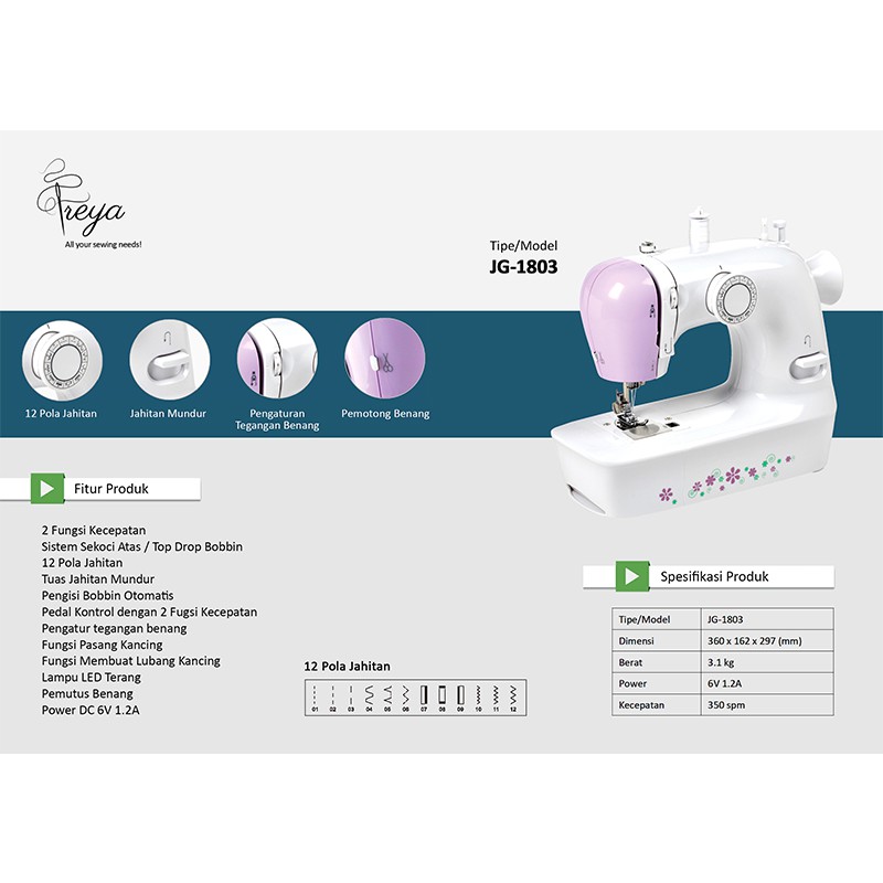 Sumber : tokopedia.com Mesin Jahit Portable Mini Deluxe Freya Jg 1803 Dengan 12 Pola Jahitan