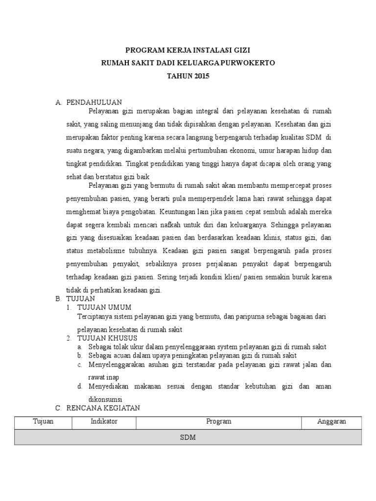 Contoh Program Kerja Instalasi Rawat Jalan. Program Kerja Unit Gizi