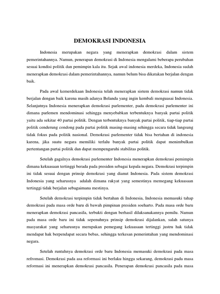 Apakah demokrasi di indonesia sudah berjalan dengan baik. Apakah pelaksanaan demokrasi kita sudah berjalan dgn baik sesuai yg di harapkn. Namun dalam pelaksanaannya otonomi daerah banyak mengalami kendala sehingga menjadi hambatan dalam. Adapun perjalanan sistem demokrasi yang diterapkan di amerika serikat sendiri berjalan dengan baik dari masa ke masa bahkan kini sudah menjadi salah satu negara adikuasa. Sudah 19 tahun era reformasi berlangsung namun pelaksanaan demokrasi pancasila masih belum baik. Indonesia terus mengalami kemunduran dan masih jauh dari sempurna dalam bidang politik ekonomi dan sebagainya. Demokrasi yang mencakup lima nilai dasar masyarakat indonesia masih berjalan pincang karena terlihat belum bisa terlaksana semuanya. Alasannya tentu saja agar pelaksanaan demokrasi di indonesia tidak bertentangan dengan falsafah bangsa indonesia yaitu pancasila. Jika demikian demokrasi sudah berjalan baik secara pemilu legislatif maupun pemilu eksekutif dan pelaksanaannya sudah tepat benar luber adil untuk mencapai kemakmuran dan kesejahteraan sesuai dengan pilihan rakyat baik secara pilihan organisasional maupun pilihan secara individual. Krn kita lhat akhir2 ni sistem demikrasi kita sudh berjln nmn realisasi dilapangan kadng masing ad yang senjang jawaban simpan. Merujuk pada buku memberdayakan masyarakat dalam pelaksanaan 10 pilar demokrasi karya ahmad sanusi terdapat 10. Demokrasi sudah akrab di telinga orang indonesia karena memang sistem demokrasi digunakan di indonesia. Sebagai warga negara tentu kita yang merasakan dampak dan akibat kepincangan tersebut.