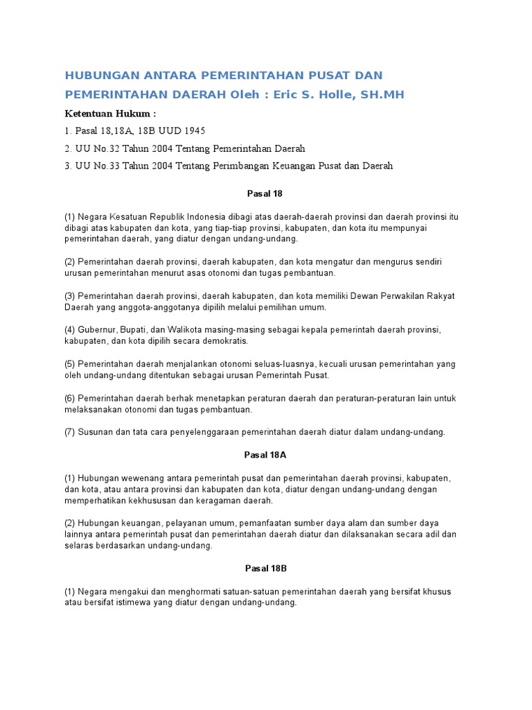 Pemerintah Daerah Menjalankan Otonomi Seluas Luasnya Berdasarkan Asas. Hubungan Antara Pemerintahan Pusat Dan Pemerintahan Daerah